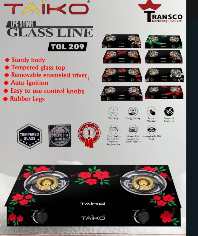 Taiko TGL-209 LPG Gas Stove Glass Line – Double Burner Tempered Glass Top Auto Ignition Gas Cooker