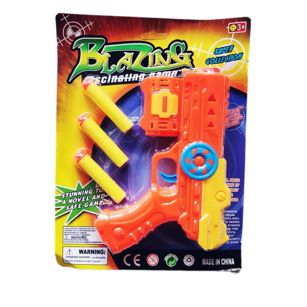 Blazing Dart Gun Includes 3 Soft Bullets Colors: Orange / Green Good Quality Value for money Ages: 3 years and above Package size: 24.5cm x 18.5cm Made in China