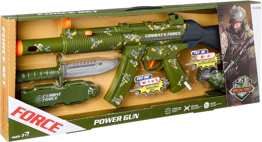 Force Power Gun Model No: 34260 Gun vibrates while shooting Lights & Sound Effects available 100% Safe for Kids Non-sharp Plastic Knife, Knife holder and hand grenade included Gun s... Read More