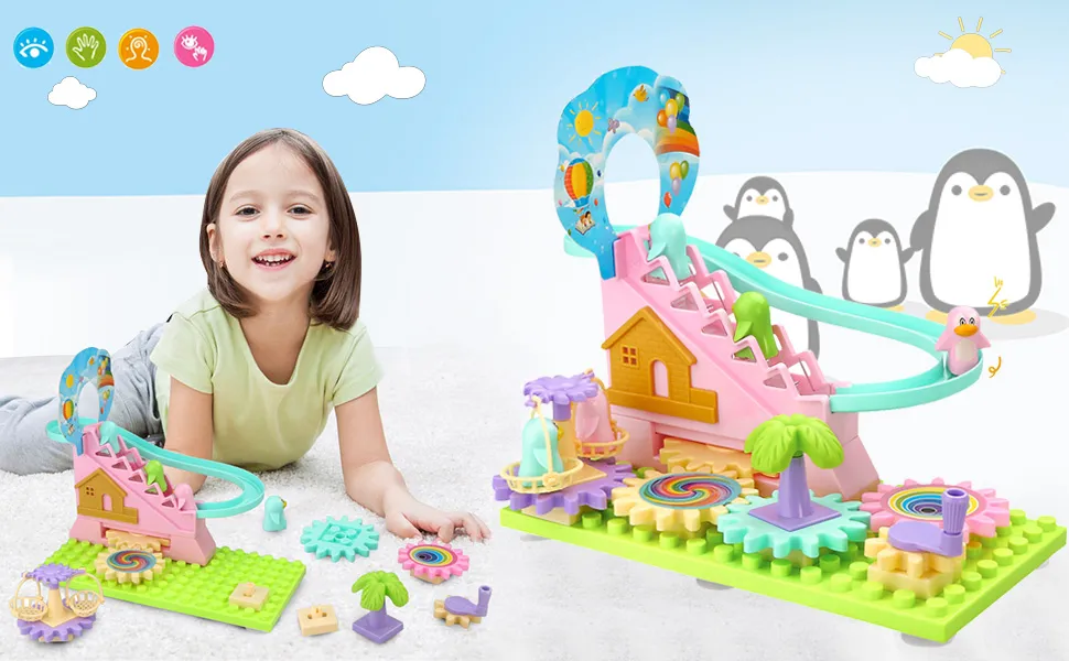 Penguin Manual Block Track Set with Climbing Stairs Orbital Track Toy For Kids