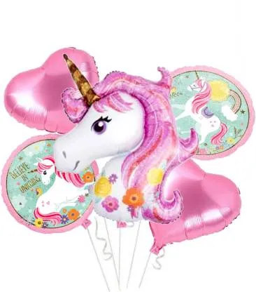 Unicorn print foil balloons for birthday & theme party. Pack consists of 2 star/heart shaped, 2 round shaped unicorn printed and 1 unicorn head shaped balloon It is inflated / deflated usin... Read More