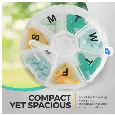 WEEKLY PILL ORGANIZER BOXES: Our larger size 7 compartment round pill organizer is the perfect helper for tracking your medication plans in daily life. This Pill Organizer is made transluce... Read More