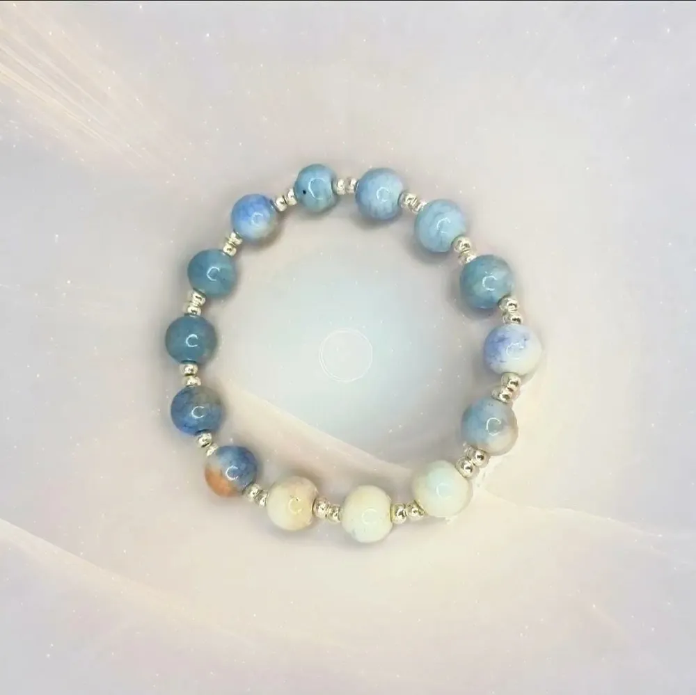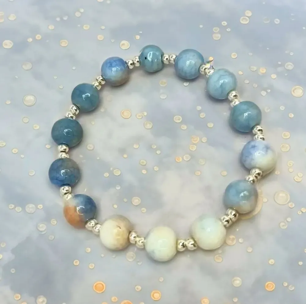 Ocean Dream Beaded Bracelet: Blue Teal Crackle Beads, Silver Charm Description Quality Angelite and Mother of Pearl gemstones, natural shell accents, handmade recycled Krobo glass ... Read More